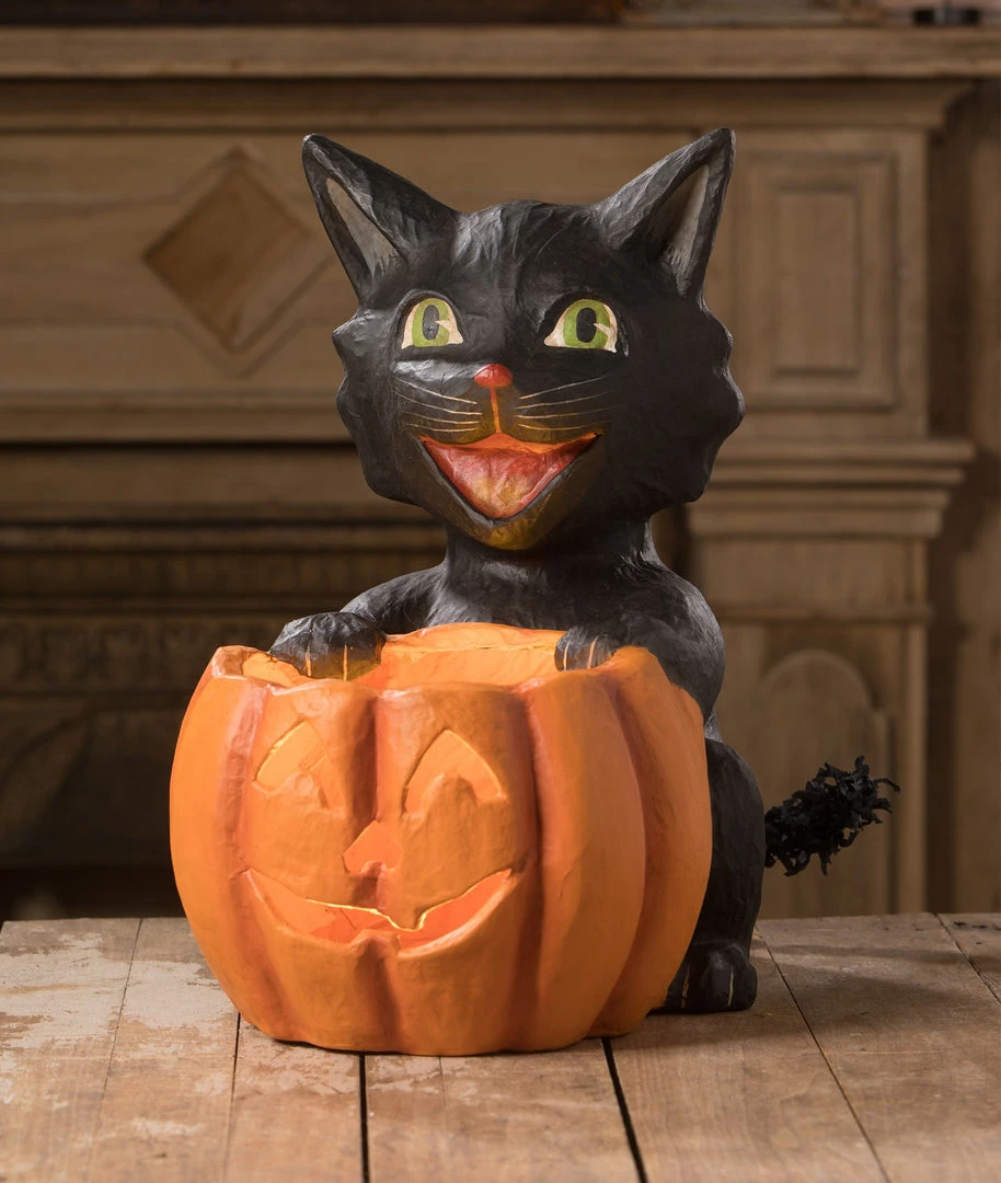 Create a spunky Halloween scene with Cat’s Got Your Pumpkin; this mischievous fella will make the little ghouls and goblins smile.