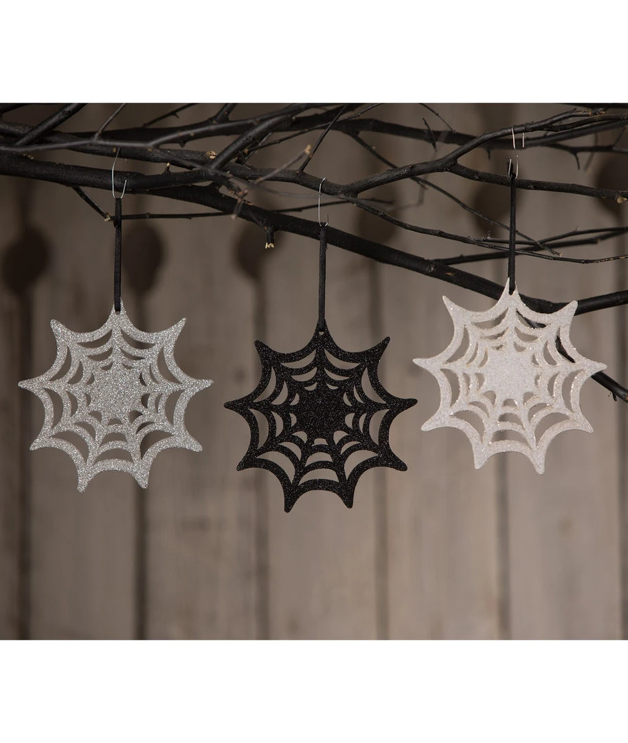 Add a little fright on Halloween night with these silver, black, and white glittered spider web hanging ornaments.