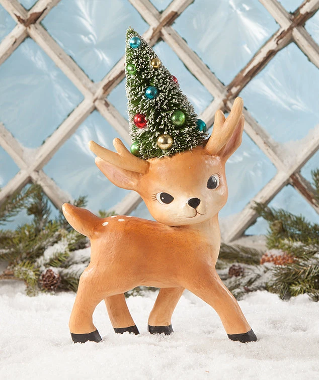Have yourself a very merry Christmas with this darling retro reindeer with bottle brush tree.
