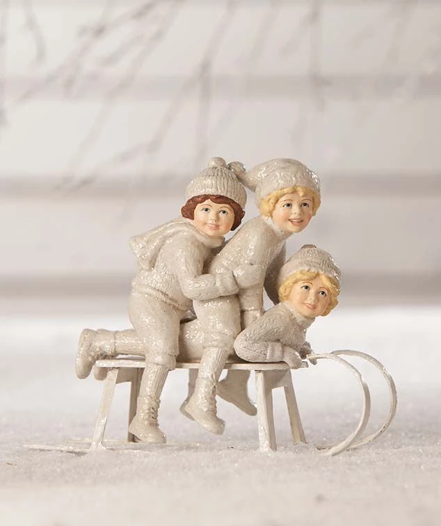 Create a magical wintertime scene with this Winter Sledding Trio designed by artist Bethany Lowe.