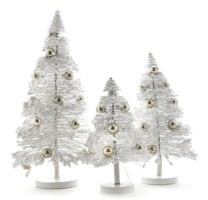 Create a winter white holiday scene with these White flocked bottle brush trees with silver balls.