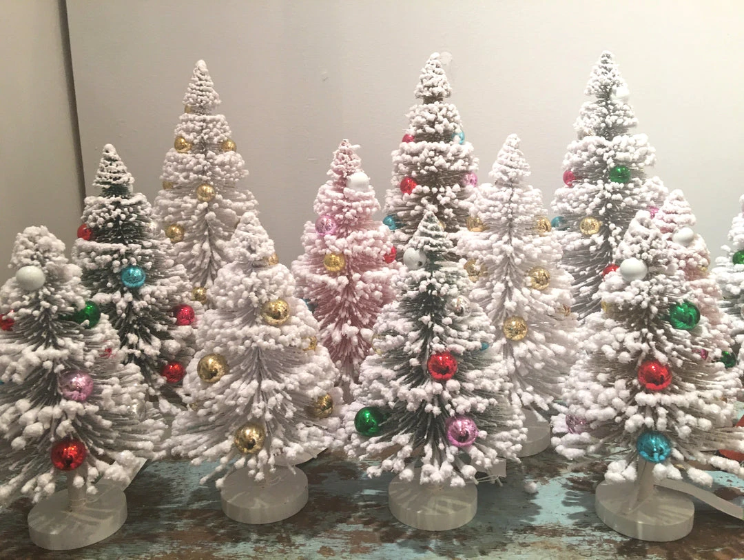 These Snowy Flocked Bottle Brush Trees decorated with multi color balls will have you feeling festive in no time.