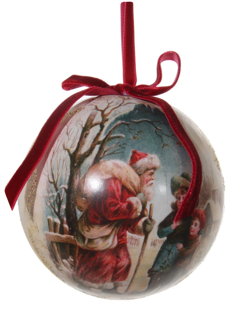 Bring a vintage-inspired touch to your Christmas decor with this lovely Victorian Santa bringing gifts decoupage ball ornament.