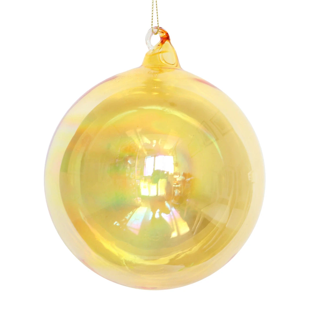 Give your Christmas decorating designer style with these transparent amber glass ball ornaments with an iridescent finish.
